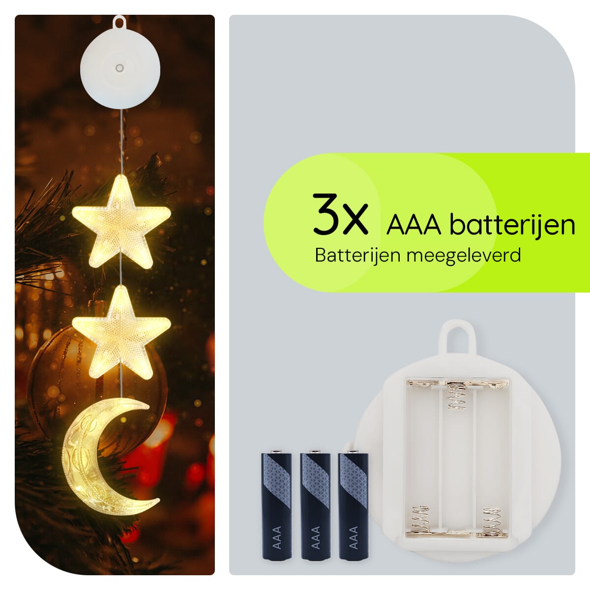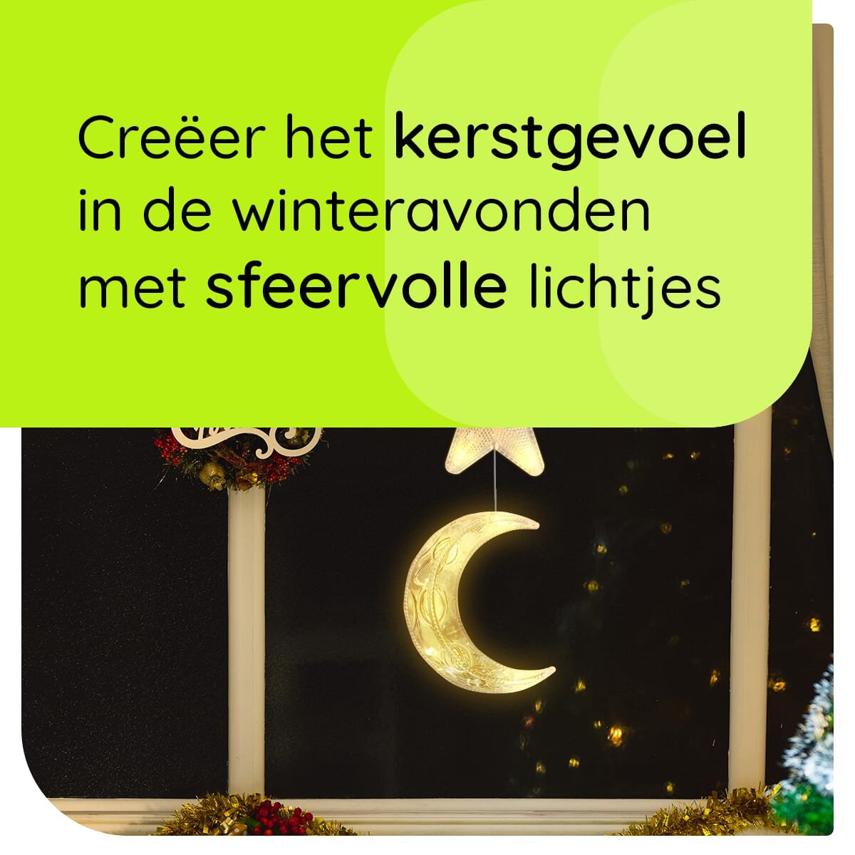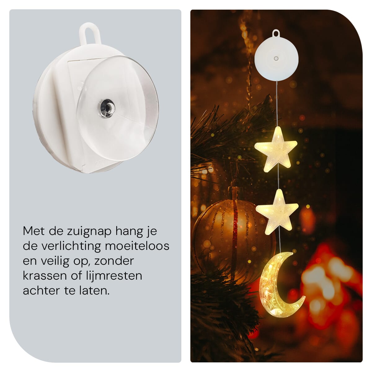Breng de magie van de feestdagen naar je huis met deze prachtige kerstverlichting voor het raam. Met een sfeervol ontwerp van sterren en een maan, creëer je een warme, feestelijke ambiance die iedereen zal betoveren. Deze kerstdecoratie voor binnen is eenvoudig te bevestigen met een handige zuignap, waardoor je in een handomdraai je ramen kunt omtoveren tot een stralend middelpunt.
