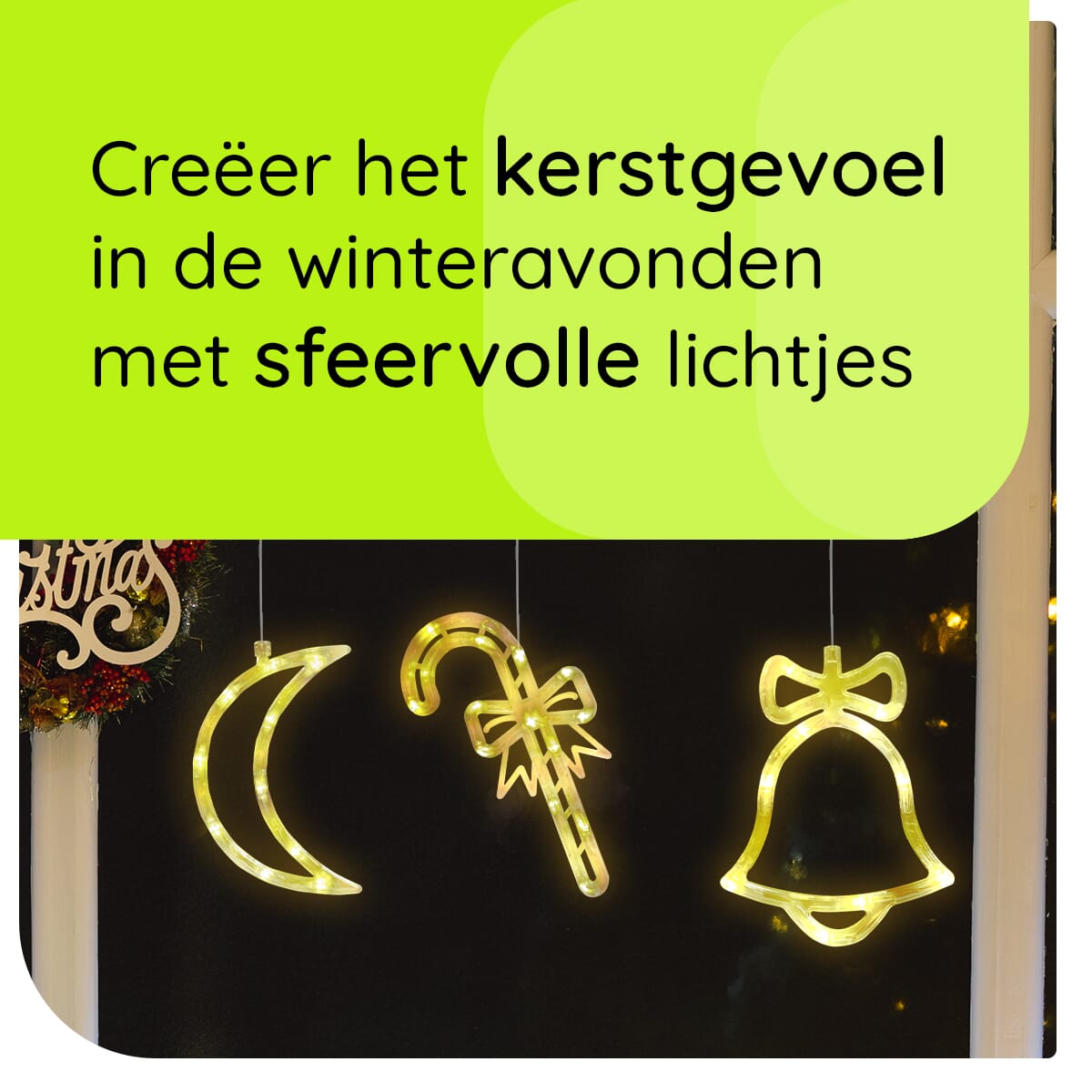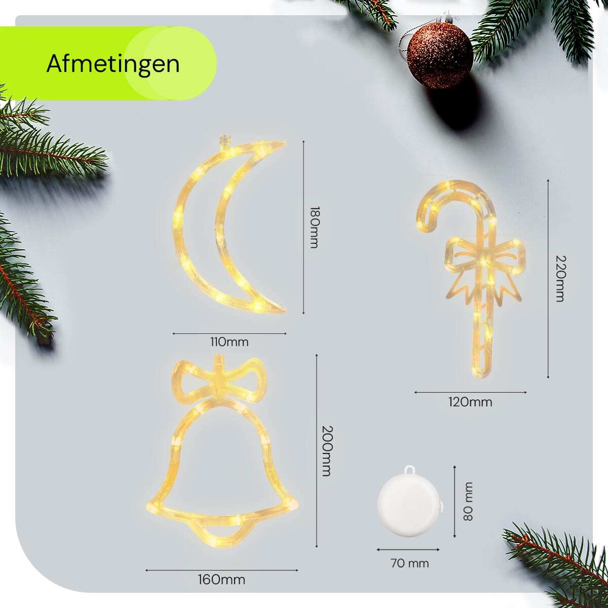 De verlichte raamdecoratie bestaat uit een maan, zuurstok en kerstbel, die elk een warme gloed verspreiden. Deze unieke combinatie zorgt ervoor dat je raam opvalt en straalt tijdens de donkere winteravonden.