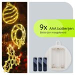 Deze raamverlichting werkt op 3×3 AAA-batterijen, die eenvoudig in de batterijhouder worden geplaatst. Met het handige koordje en zuignap bevestig je de decoratie eenvoudig aan het raam, zonder gedoe met snoeren of stopcontacten.