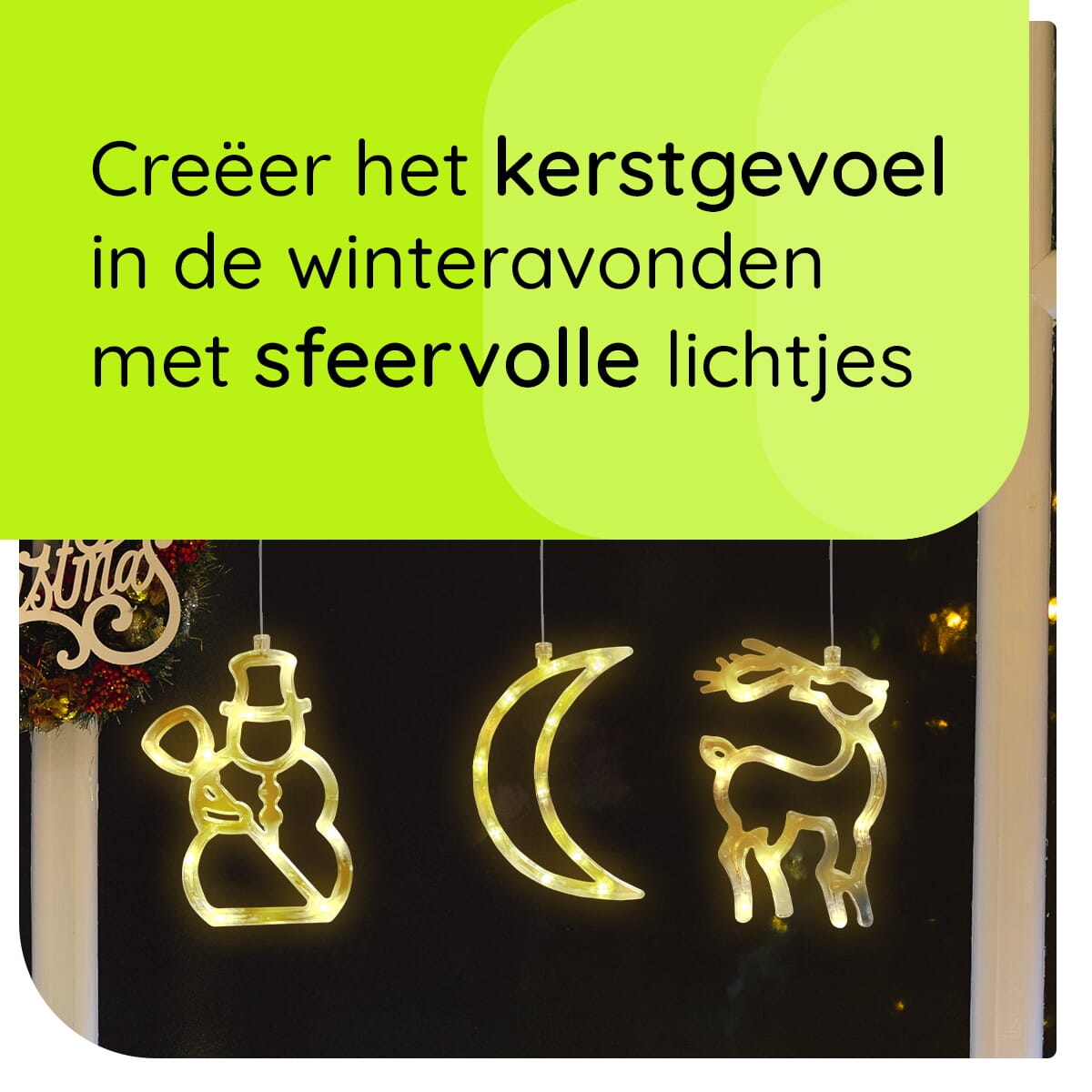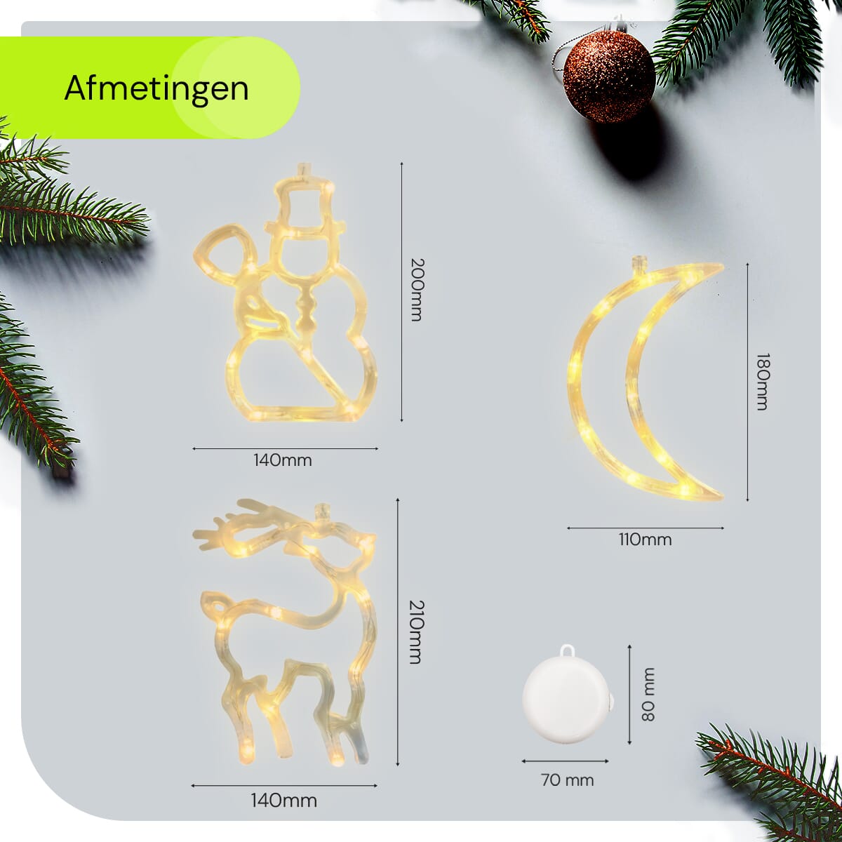 Breng de magie van kerst tot leven met onze prachtige verlichte raamdecoratie. Deze set van drie figuren – een sneeuwpop met bezem, een maan en een rendier – zorgt voor een feestelijke en warme sfeer in je huis. Perfect voor wie zijn raam in een oogwenk wil omtoveren tot een stralend kersttafereel.