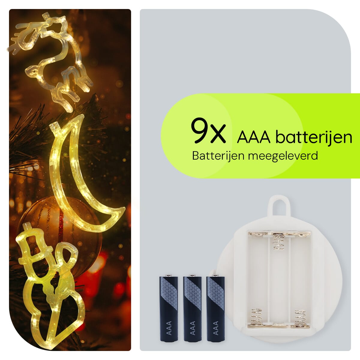 Deze raamdecoraties werken eenvoudig met een koordje en zuignap. Plaats de zuignap op het raam, trek het koordje aan en je hebt direct een sfeervolle kerstverlichting. De set wordt geleverd inclusief 3×3 AAA-batterijen, zodat je direct aan de slag kunt.