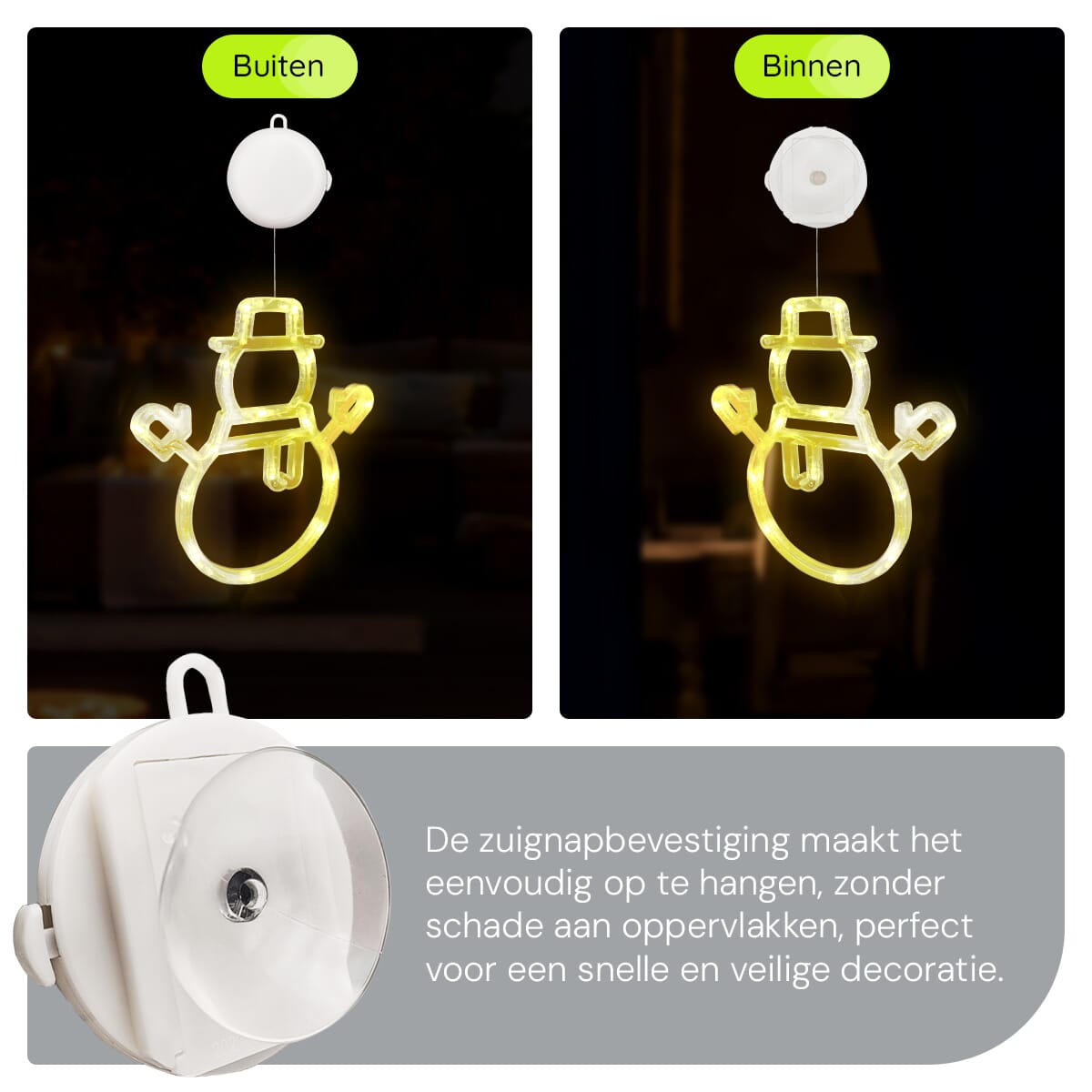 - Eenvoudige bevestiging: Dankzij de zuignap bevestig je de sneeuwpop gemakkelijk aan elk raam zonder gedoe met schroeven of tape.