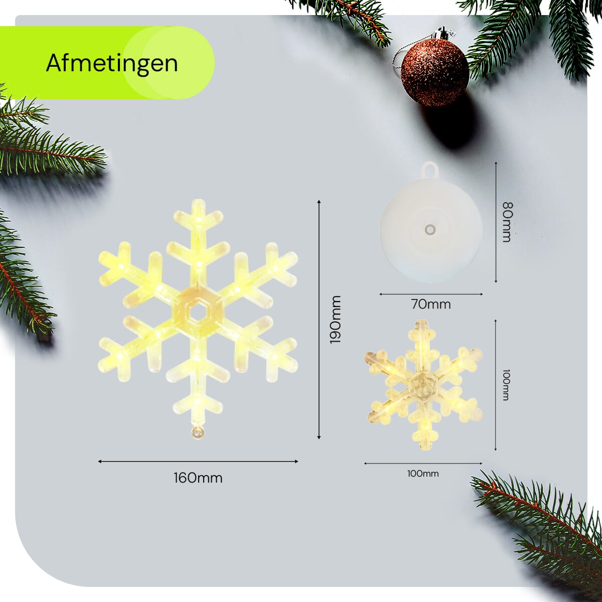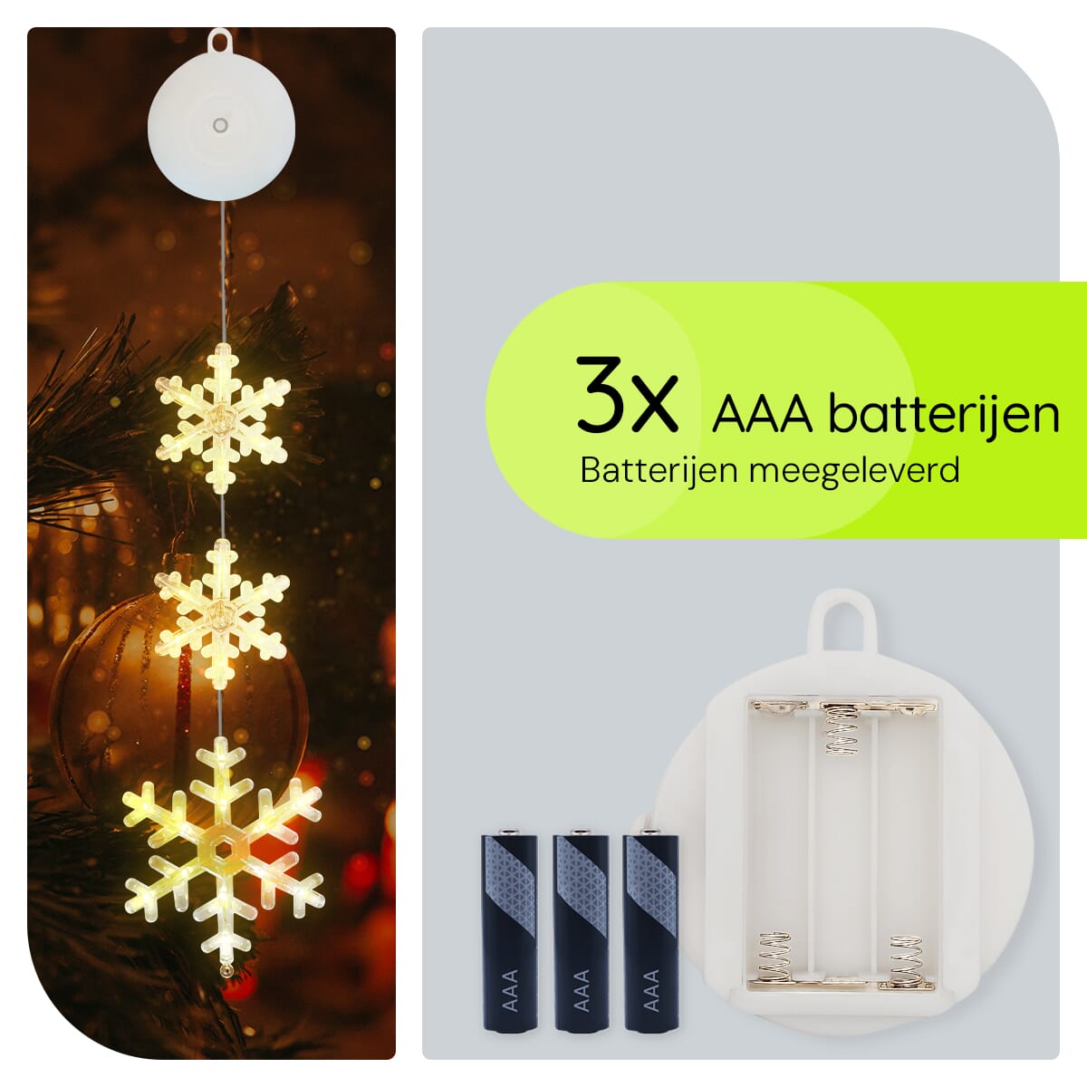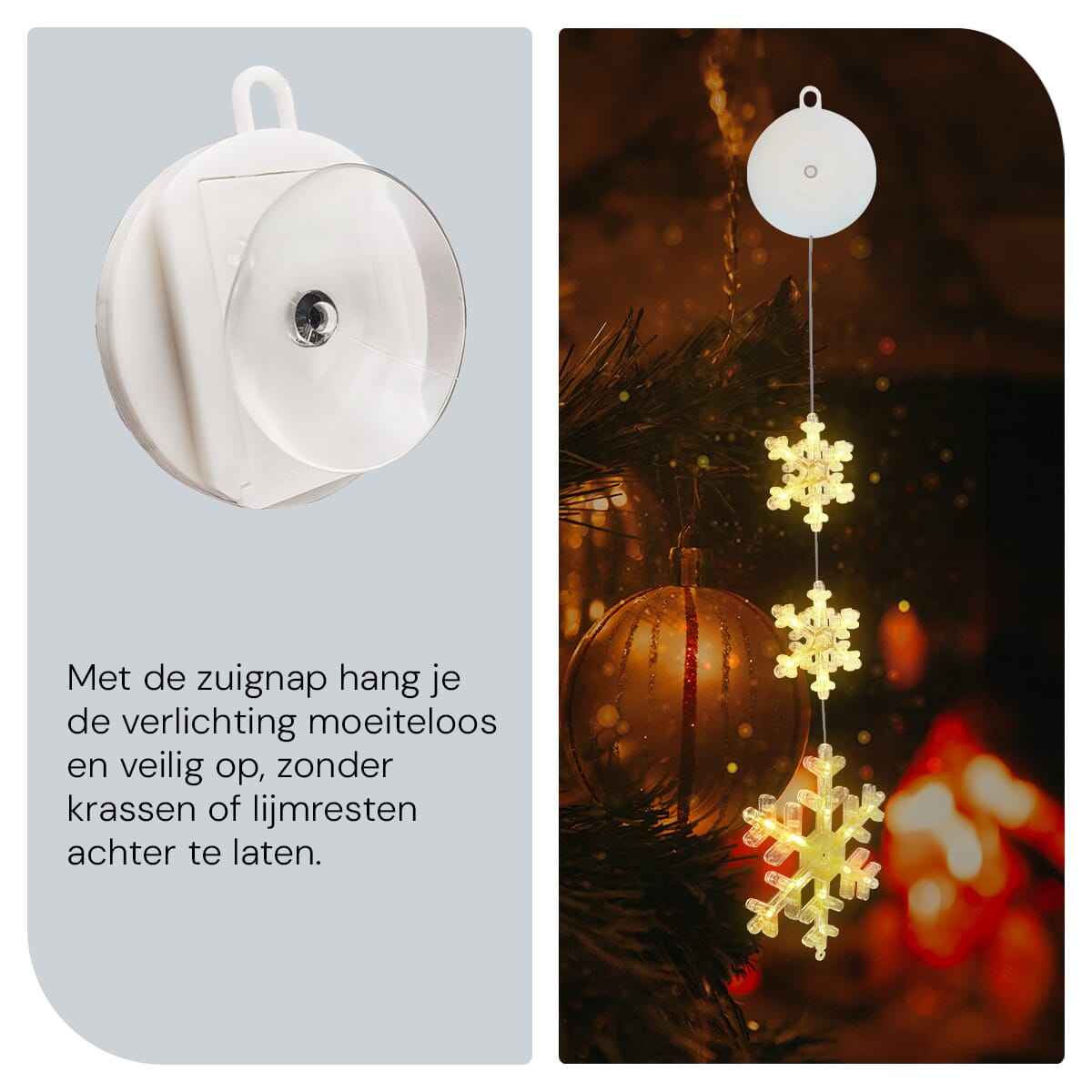 Met de meegeleverde zuignap kun je de kerstverlichting snel en gemakkelijk aan elk raam bevestigen. Geen gereedschap nodig! Plaats de zuignap op het raam, hang de sneeuwvlokken op, en geniet direct van de sfeervolle verlichting.