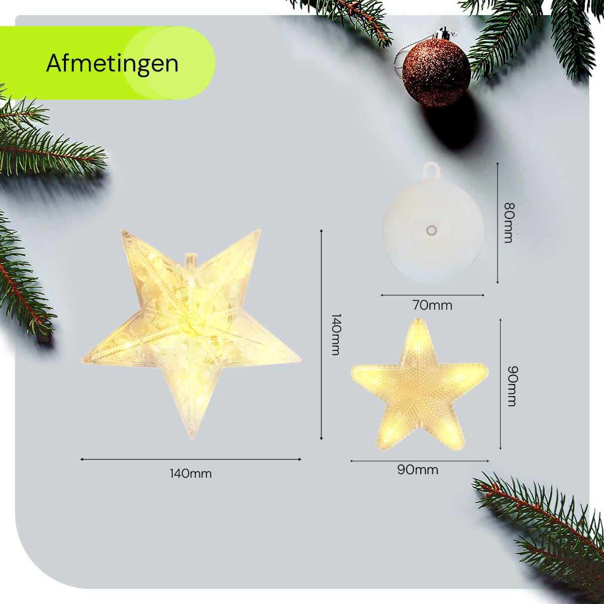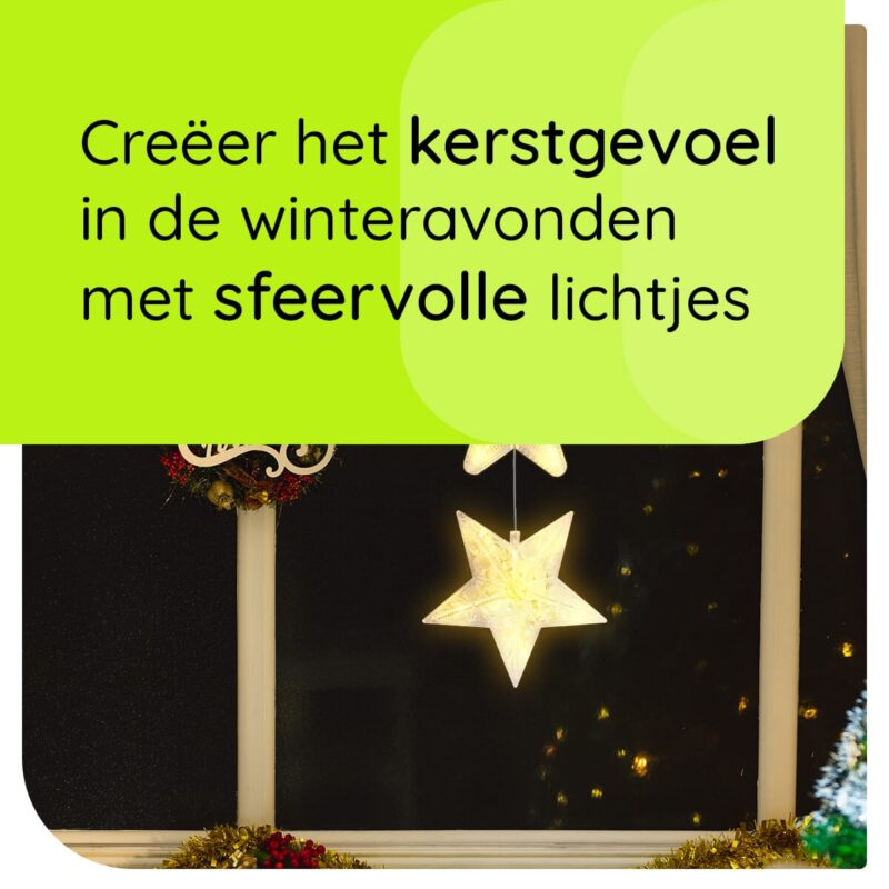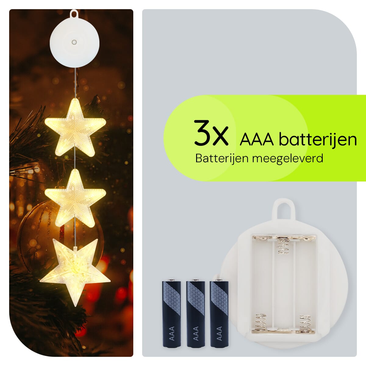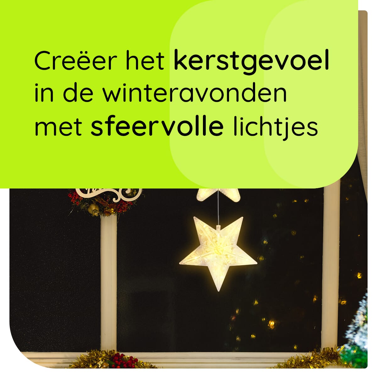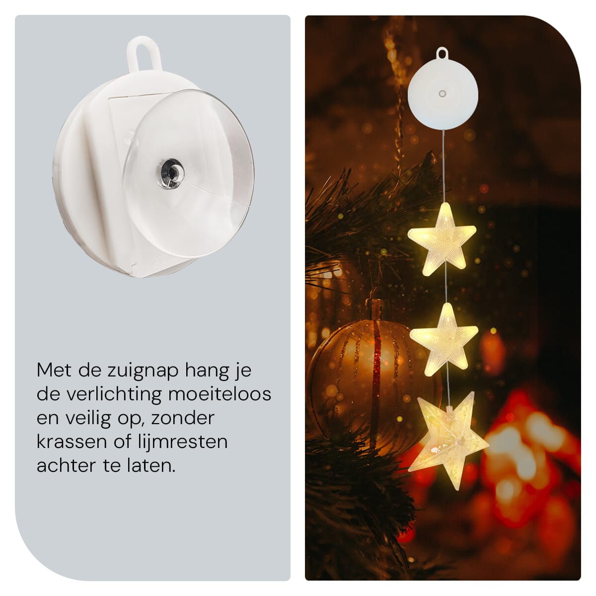 Breng de magie van Kerstmis naar je huis met deze schitterende kerstverlichting in de vorm van sterren. Perfect voor het raam, deze decoratie zorgt voor een warme, uitnodigende sfeer die voorbijgangers betovert en je interieur een feestelijke uitstraling geeft. Met een eenvoudig te bevestigen zuignap en inbegrepen batterijen, is deze kerstdecoratie voor binnen de ideale manier om je feestdagen op te lichten.