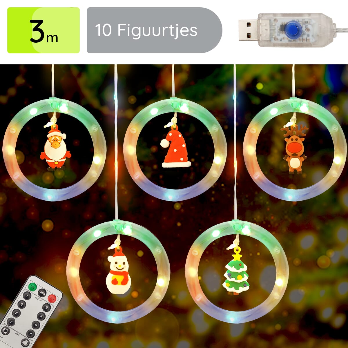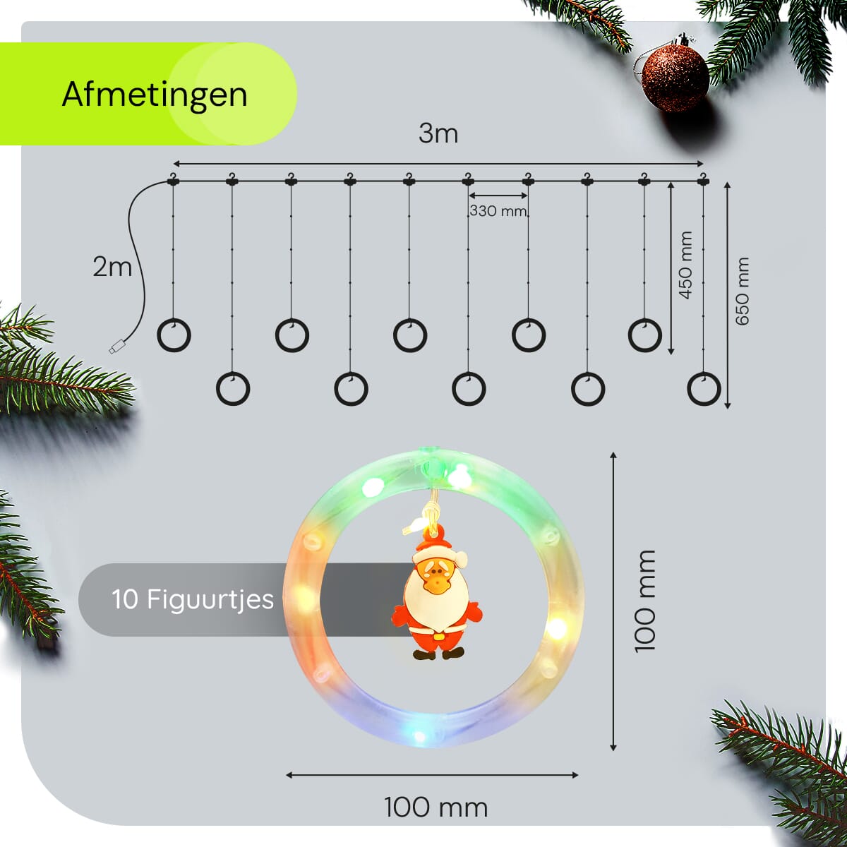 Breng een magische kerstsfeer in huis met deze prachtige kerstdecoratie lichtslinger van 3 meter. De slinger bestaat uit 10 lichtcirkels versierd met vrolijke kerstfiguren zoals de kerstman, denneboom, sneeuwpop, rendier en kerstmutjes. Perfect voor het creëren van een warme en feestelijke ambiance in je woonkamer, slaapkamer of zelfs in je raam als kerstverlichting.
