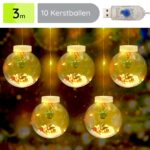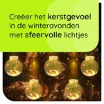 De lichtslinger bestaat uit tien doorzichtige kerstballen, elk gevuld met een delicate sneeuwlaag en een kleine denneboom. Dit unieke ontwerp maakt het een prachtige kerstdecoratie voor binnen, perfect om een warme en feestelijke sfeer te creëren in je huis. De warme witte LED-verlichting zorgt voor een zachte gloed die elke ruimte verlicht.