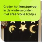 Breng de magie van de feestdagen naar je huis met deze betoverende set kerstverlichting. Deze unieke set van drie figuren – een halve maan, een maan en sterren – zorgt voor een warme en feestelijke sfeer in elke kamer. Perfect voor wie op zoek is naar prachtige kerstdecoratie voor binnen.