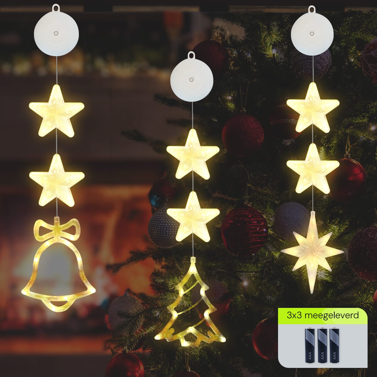 Kerstverlichting set voor het raam met kerstbel, kerstboom en noorderster
