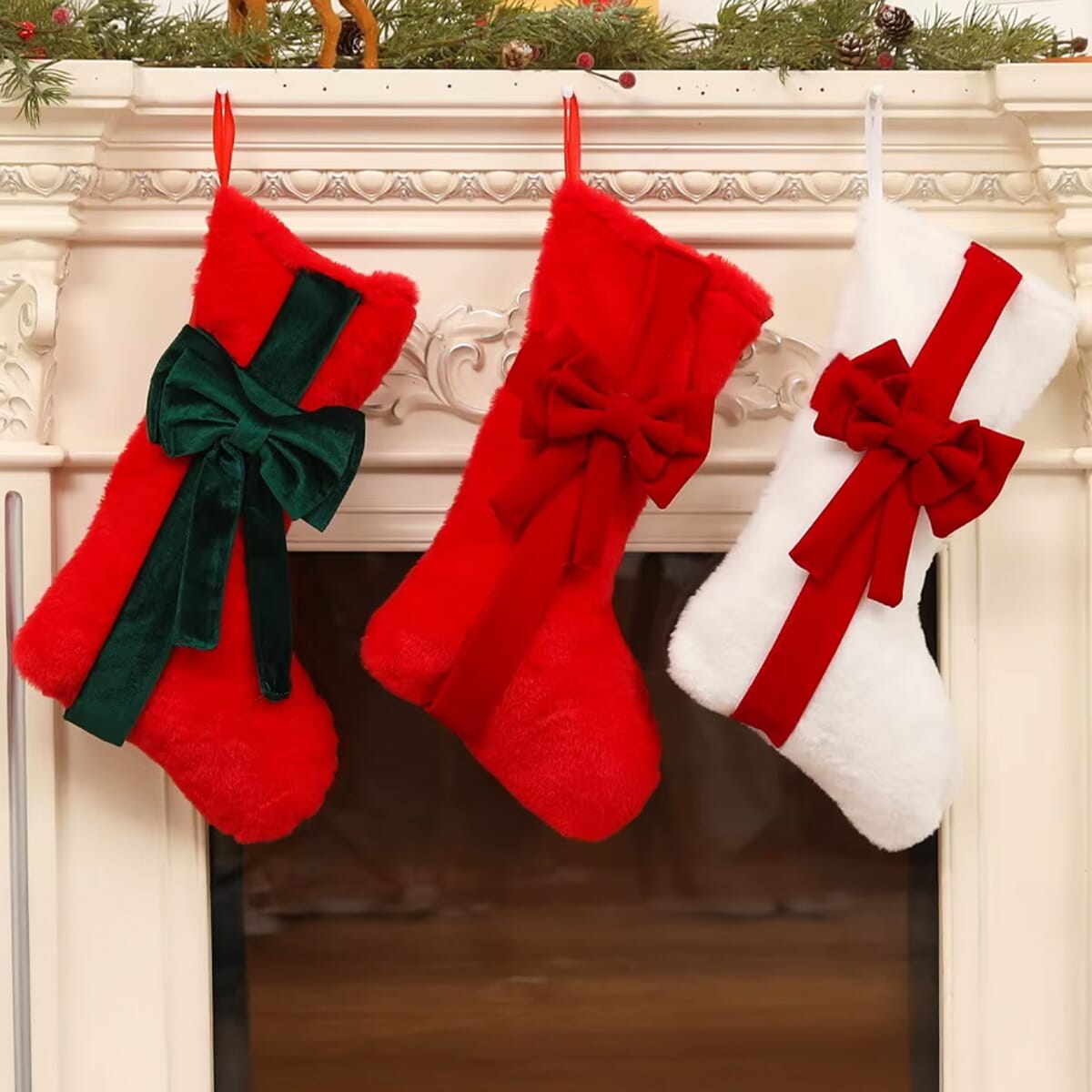 Set van 3 Pluche Kerstsokken – Rode Kerstkousen met Strik