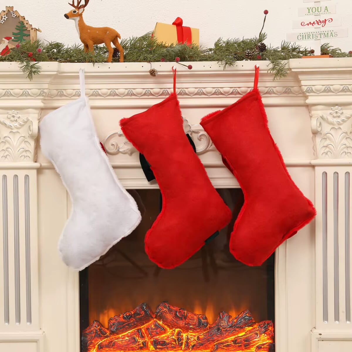 Deze set van pluche kerstsokken is een praktische en sfeervolle toevoeging aan je kerstdecoratie.