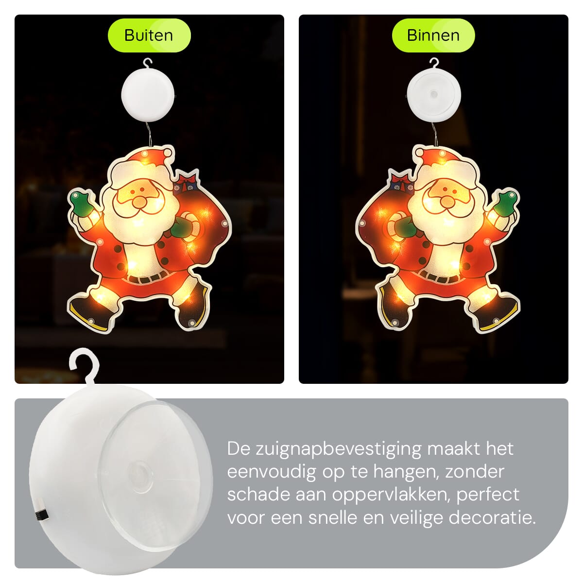 - Eenvoudige bevestiging: Dankzij de handige zuignap hang je de raamverlichting moeiteloos op elke gewenste plek.