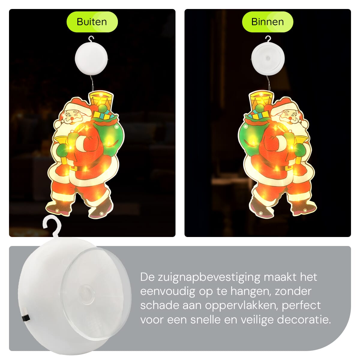 - Eenvoudige bevestiging: Dankzij de handige zuignap blijft de kerstverlichting stevig op zijn plek op je raam.