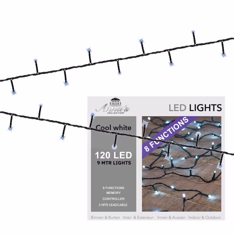 - 120 heldere LED-lampjes in koel witte kleur.