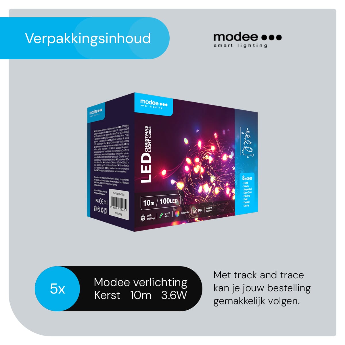 De 100 LED lampjes op de Modee Lichtsnoer Kerst 10 Meter zijn niet alleen helder en kleurrijk, maar ook energiezuinig. Dit betekent dat je langer kunt genieten van de feestelijke verlichting zonder je zorgen te maken over een hoge energierekening. Bovendien gaan LED lampjes veel langer mee dan traditionele halogeenlampen, waardoor je jaar na jaar plezier hebt van deze lichtslinger.