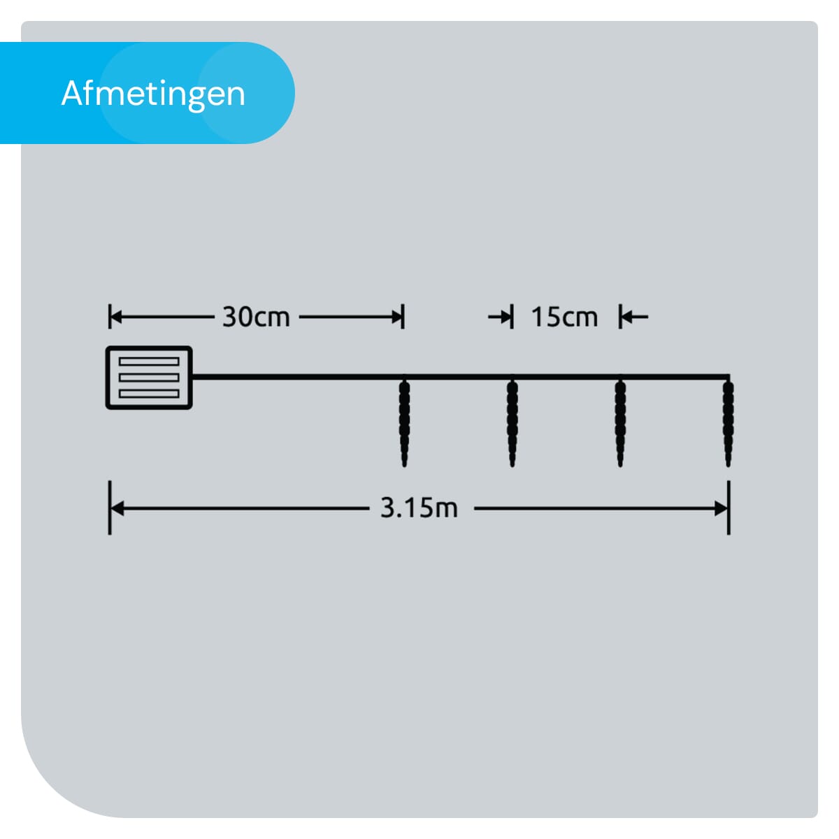 De Modee Lichtsnoer Kerst IJspegels werkt op 3xAA batterijen, die eenvoudig in de batterijhouder geplaatst kunnen worden. Schakel de lichtslinger in met de aan/uit-schakelaar en geniet direct van de sfeervolle verlichting. De 20 LED lampjes zijn gelijkmatig verdeeld over de 2.85 meter lange snoer, met een afstand van 15 cm tussen de lampjes, wat zorgt voor een mooie en gelijkmatige verlichting.