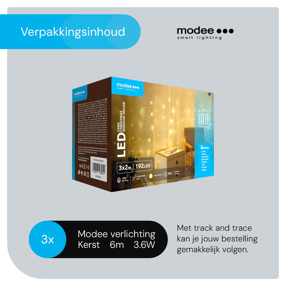 - Is het lichtgordijn waterdicht? Ja, het Modee Lichtgordijn heeft een IP44-classificatie, wat betekent dat het spatwaterdicht is en geschikt voor buitengebruik.